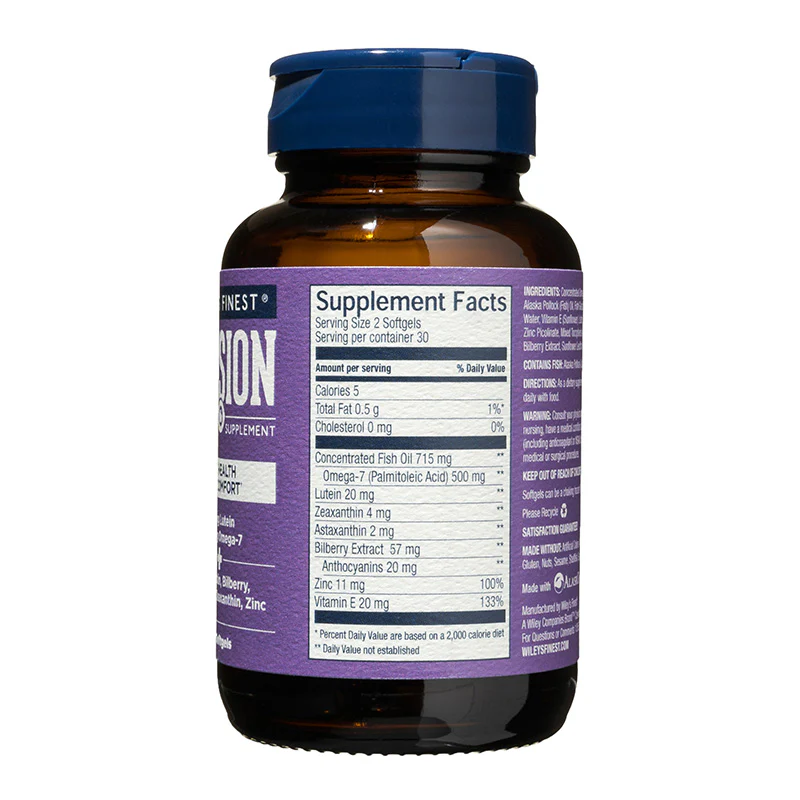 Ingredients: Concentrated Omega-7 Ethyl Esters from Wild Alaska Pollock (Fish) Oil, Fish Gelatin, Palm Glycerin, Purified Water, Vitamin E (Sunflower), Lutein & Zeaxanthin in Safflower Oil, Zinc Picolinate, Mixed Tocopherols (antioxidants), Astaxanthin, Bilberry Extract, Sunflower Lecithin, Beeswax